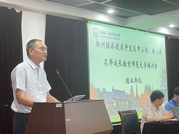 随后扬州经济技术开发区教育集团师资管理部的于晓莹部长发言,表达了对南京师范大学精心安排此次培训的感谢,认为通过此次培训,学员老师们深入了解了教育改革的新要求和新举措,学习了先进的教育理念和教学方法,拓宽了教学思路和教学手段,并且呼吁参与培训的老师们将本次培训的成果转化为实际行动,将所学知识应用到实际教学中,更好地为学生的成长和发展以及学校的发展做出贡献!