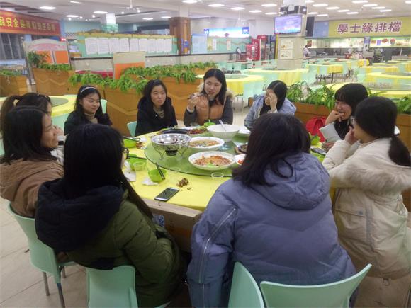 最后,就是餐后总结。在餐后总结过程中,班长廖秋萍同学提到了学习方面和生活方面的内容,在学习方面强调自觉独立,尤其是鼓励同学们有目标有方向地备战即将到来的期末考试;在生活方面愿意与同学们进行深入地交流与沟通,有困难找班长。同时,廖秋萍同学还说,希望同学们在新的一年学习上能有更好的发展、更多的收获,生活中健康平安。