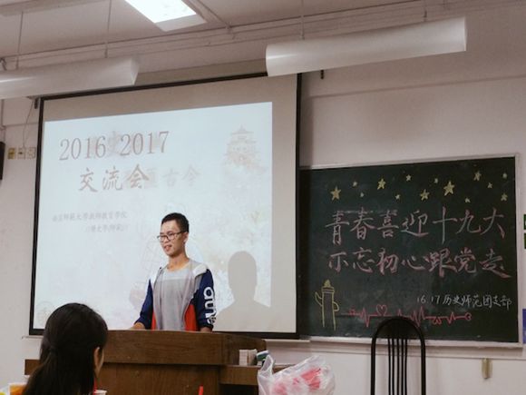16级历史师范17级历史师范于9月29日举办了经验交流会。旨在为17级新生的学习生活提供经验,帮助新生尽快融入大学生活。