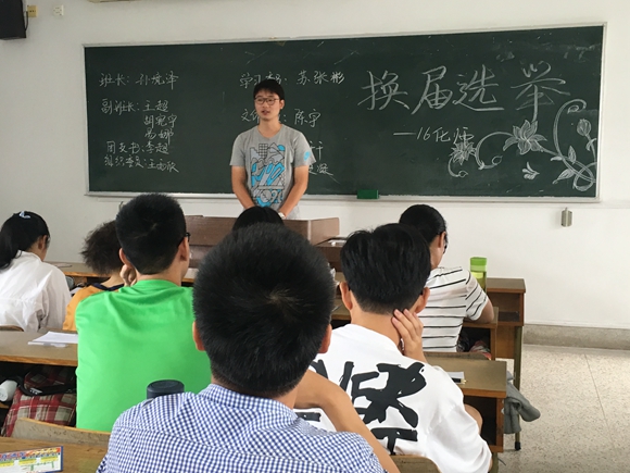 16级化学(师范)班在学明楼410教室成功举办了班委换届选举活动,同学们踊跃报名。本次活动由班长孙境泽主持。