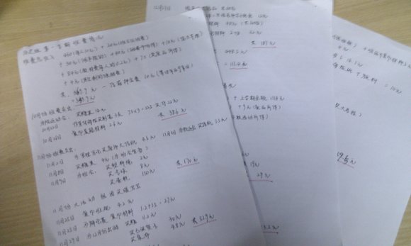 10级历史师范班生活委员魏虹同学将大一学年班级财务情况报表整理公开,递与各宿舍进行班级财务透明化的除实践。