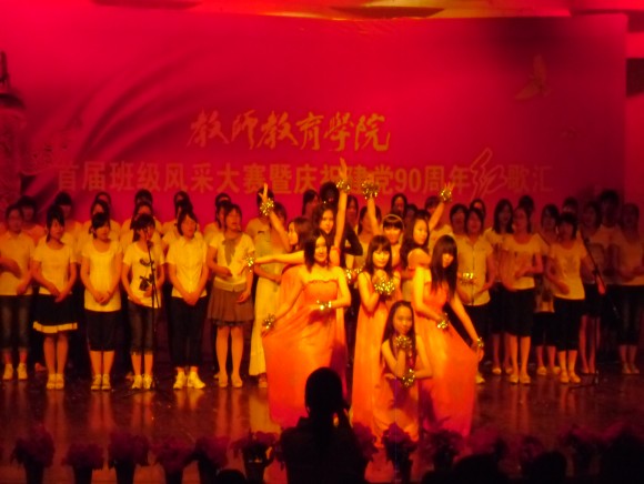 首届班级风采大赛暨庆祝建党90周年红歌汇”的文艺活动。英语师范班积极参与并表现精彩,荣获文科专业一等奖的好成绩。