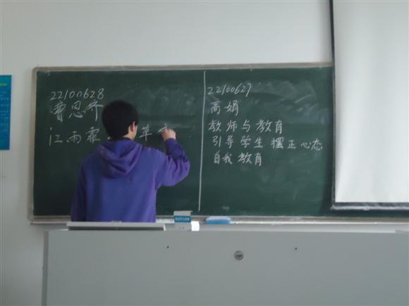 的师范生,微格训练对提高大家的说课能力和讲台风范有很大帮助。本次同学们的微格训练由三部分组成:自我介绍、演讲和粉笔字。首先,同学们按照学号顺序上台写下姓名和学号,并自由书写二十个粉笔字,随后便开始演讲。