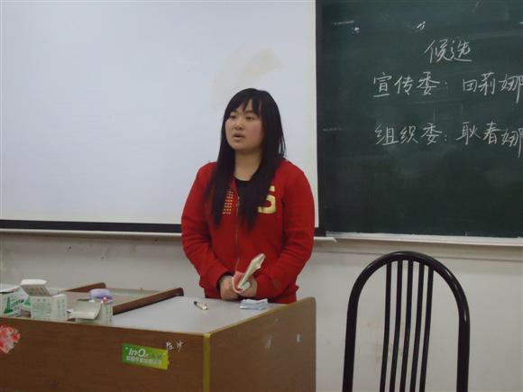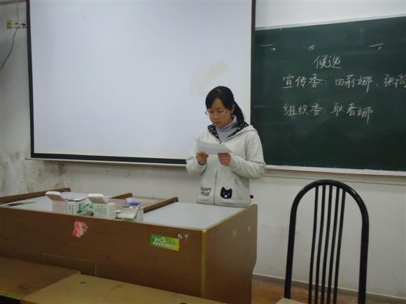 班会主要就团支部宣传委员和组织委员的职务进行了改选。田莉娜、张尚琦、耿春娜等同学参与了竞选,在同学面前分别陈述了自己对所竞争职务的看法、对相关工作的规划和对数师未来的美好展望。陈述完毕后班级组织了投票计数,本着公平、公正的原则选出了相应的新任班委。