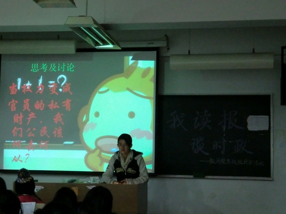 在21世纪这个追求现世幸福的时代,“经济”早已成为与人类生活关系最为密切的关键词之一。徐楷森同学作为第一组代表,首先和大家分享了他们组的“经济哲学”。他将主题命名为“时话‘徐’说”,依次介绍了美国经济、中国经济乃至江苏经济的现状和未来发展趋势,层层递进、深入浅出,言谈间尽显评论家的风采,将当今全球经济状况做了完整而深刻的剖析,令人叹为观止。政治专题组的演说也是精彩无限。他们以时下最热门最火爆的“我爸叫李刚”事件为切入点,和同学们共同探讨了政府官员及后代滥用职权的严重问题,以小见大,并给大家留下了“当权力变为官员的私有财产时,公民该何去何从”的深刻思考。接着,文体版块的同学为大家带来了一场视听盛宴,从“网络流行语”、“王贝整容之死”、“网络红人”三个角度以视频、音乐、图片、文字等多种形式展开讲述,其中对“南师校草评比”事件的探讨更是将现场的活跃气氛提升到最高点。最后,党团组的展示作为压轴版块登场,虽然内容稍显枯燥,但同学们的积极性和热情丝毫没有削减,并以热烈的掌声表达了对他们的尊重和鼓励。本次团日活动也圆满落幕。