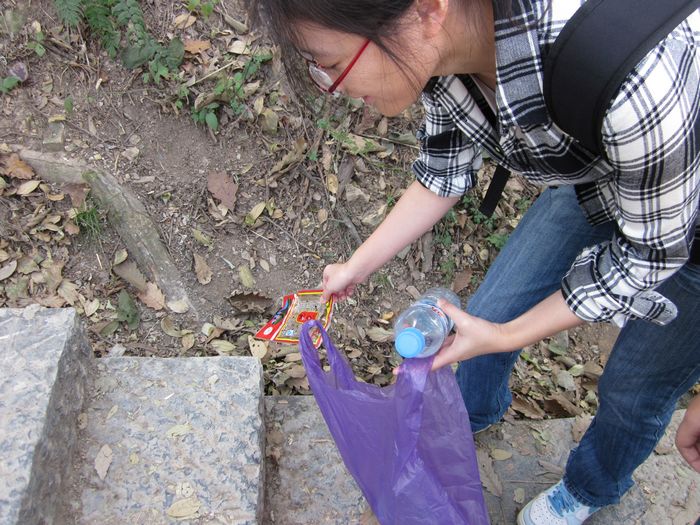 到达山顶后,虽然未能参观正在整修中的紫金山天文台,大家却依然兴致不减,拿出相机合影留念,记录下这青春的美好时刻。下山前,同学们虽然疲惫却并未忘记此行的另一个任务, 拿出事先准备好的垃圾袋,开始了“捡起小垃圾,维护紫金山”的环保志愿活动。同学们捡起路上散落的垃圾,按照可回收、不可回收分类放在不同的袋子里,下山后,统一扔进垃圾箱。尽管我们所做的努力对于维护整座紫金山的环境是微不足道的,但是我们自觉的环保志愿活动传递了一种“保护环境,从我做起”的理念,也带动了他人加入到这项活动中来,当我们看到身边的登山者也纷纷捡起脚边的垃圾,我们由衷地感到欣慰与快乐。在经历了三个小时的登山活动后,我们依依不舍的告别了紫金山,但我们永久地铭刻下这段与青春、汗水和友谊有关的故事。