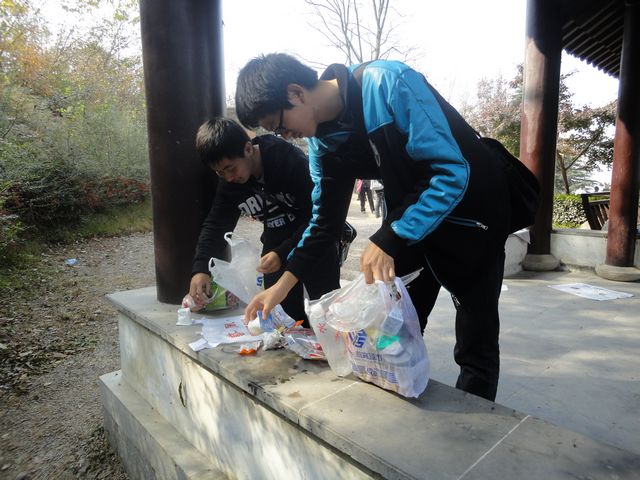 午餐时间,大家拿出食物在山顶野餐,席间还玩起了杀人游戏,有说有笑,不亦乐乎。偶尔还会引起路上游人好奇的围观。聚餐接近尾声,同学们纷纷拿出事先准备好的垃圾袋将垃圾搜集并分类扔进了垃圾箱。下山前,女生们为人满为患的厕所苦恼不已,男生们主动提出为女生守门,让她们先去空无一人的男厕,这主意虽然另人尴尬却不失为一个好办法。在同学们的带动下,许多男性游客也提出来站岗,迅速解决了女厕人满为患的问题。