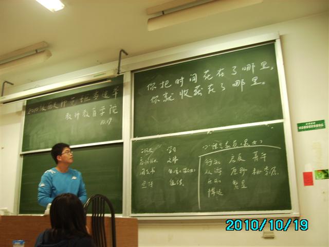 最后一个进行班委竞选的班级,历史专业班在学海楼227教师进行班委改选。提供班长、副班长、团支书、宣传委员、生活委员、学习委员、文体委员、组织委员以及心理气象员等十个职务。此次选举由同学投票当场产生结果,可以说是一次名副其实的民主选举。历史师范班主任邵博学老师出席了竞选活动。