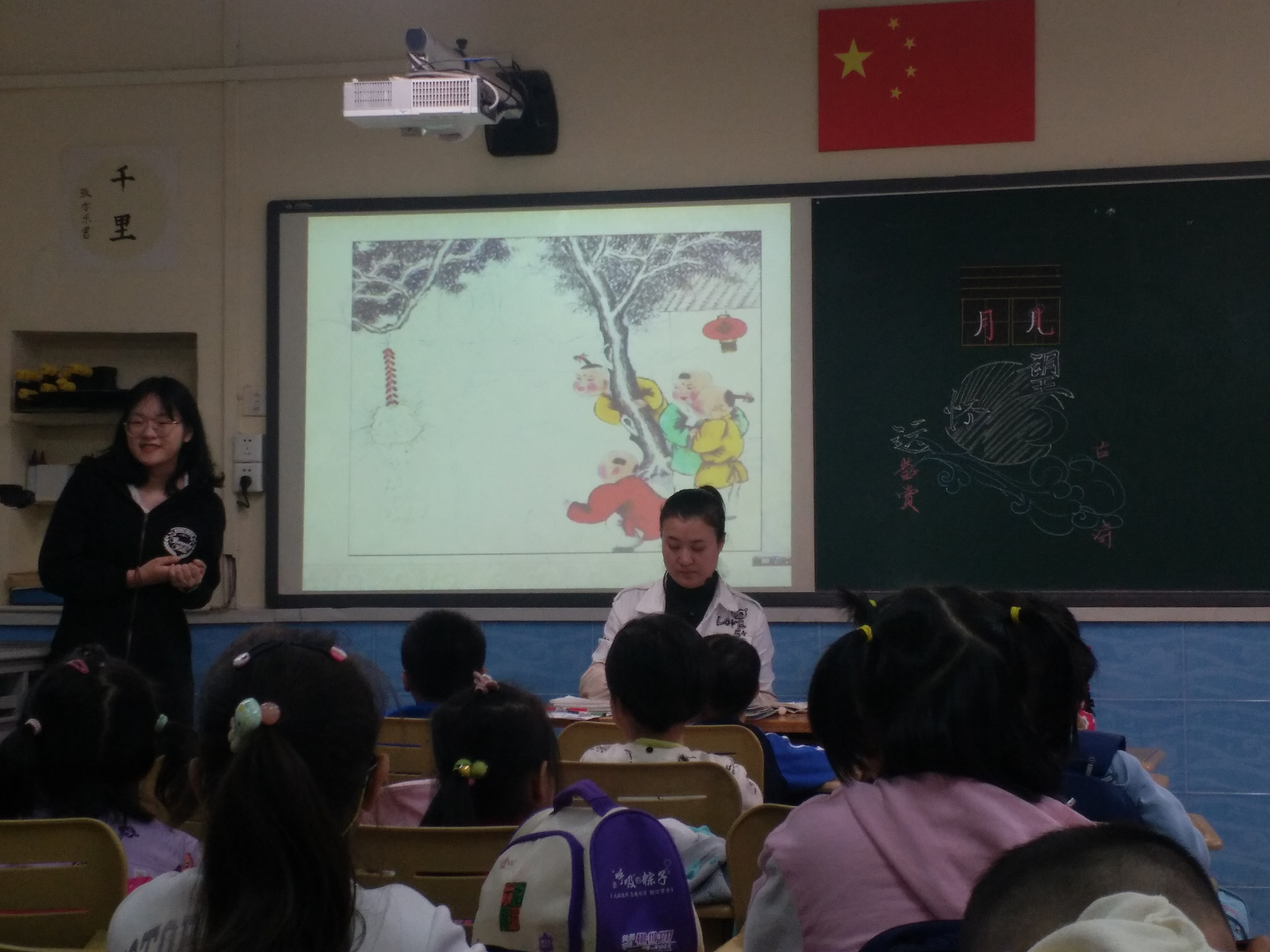 这一节课是志愿者老师带来的诗词鉴赏课——元日。首先,志愿者用生动形象的图片和解说为孩子们导入了元旦这个主题,激发了孩子们浓厚的兴趣。接着,志愿者展示了整一首古诗,并通过细致的讲解让孩子们理解这一首诗的意思和思想感情,还领着孩子们诵读这一首诗并形成记忆,提高了孩子们的语文素养。最后,志愿者和同学们进行了赛诗会,让孩子们通过阅读PPT上打出的诗句,来抢答该诗句所反映的中国传统节日,并适时地对孩子们科普传统节日的相关知识。在这一节课中,志愿者老师能够灵活地调动孩子们的学习兴趣,将单独提问和班级提问相结合,让每个孩子都有回答问题的机会;并且在朗读古诗时,注意让孩子们在诵读之时投入感情,真正做到抑扬顿挫。在最后的赛诗会上,每个孩子都得到了锻炼机会,一节诗词鉴赏课的课堂氛围十分活泼生动。整一节课上,助教老师在一旁不时地管理纪律,孩子们在课上的表现都很出色。