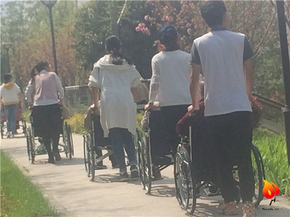 有一位志愿者带着两位老人,虽然爷爷奶奶走得很慢,但志愿者担心爷爷奶奶会摔倒,便多次询问爷爷奶奶是否需要搀扶,被婉拒之后,志愿者便留心爷爷奶奶走的距离,每隔一定距离,走到阴凉之处,就和爷爷奶奶商量着要不要歇歇脚。志愿者一边走还一边询问爷爷奶奶最近的身体状况,爷爷奶奶们也询问志愿者的学习情况,志愿者还时不时地学了几句戏曲,爷爷奶奶听着可高兴了。还有几位志愿者推着轮椅,带上爷爷奶奶们,看看湖的美丽风景,路边的花儿开得鲜艳,志愿者推着老人走近花树,教爷爷奶奶们辨别海棠,樱花和桃花。欢声笑语留了一路。
