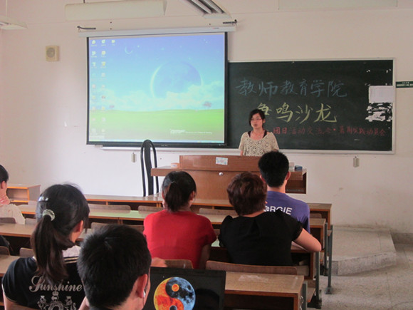 “争鸣”沙龙的第二部分是暑期社会实践实践动员会,由张莹莹同学主持。她首先指出,本次动员会的主要受众是团支书,目的一方面在于向11级的团支书简单介绍暑期社会实践,另一方面也是对上一年度教师院的暑期社会实践进行回顾。她希望各团支部能有专人负责暑期社会实践的相关事宜,便于资料的整理和集中。接着,张莹莹同学就暑期社会实践的概念、形式、意义和流程进行了说明,并布置了今年暑期社会实践的前期工作。本次“争鸣”沙龙在严谨而不失热烈的氛围中结束。