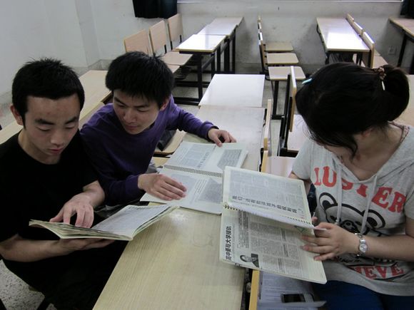 团总支的成员在组织部同学的倡导下,正在认真学习简报本上的时政新闻。学习过程中,同学们认真探讨了自己对于一些社会热点问题的见解,并把对这些问题的看法一一列在简报本的空白处。