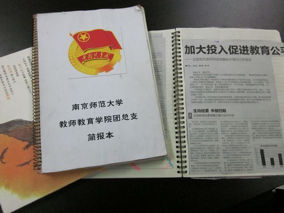 团总支组织部的一项特色工作,组织部的同学定期将报纸上的时政要闻剪贴下来,并将简报本划分了不同的板块,如“教育•大学生”专栏,“国内外时事•经济•科技•文化•体育”专栏以及“评论•感悟”等板块。每一版都内容详实,装饰精美。组织部的同学在制作简报本的过程中分工明确,每人负责一个板块,并且定期轮换。简报本配合定期开展的组织生活,每两周在团总支内部传阅一次,首先保证了组织内部的每位同学都能对当前的时事热点有一个较为全面的认识。其次,在争鸣沙龙活动中,也会邀请各支部的团支书或团支委其他同学共同学习简报本的内容,并对简报本提出建议。