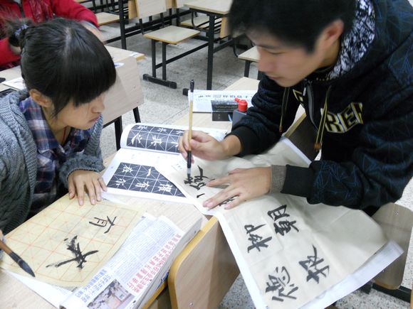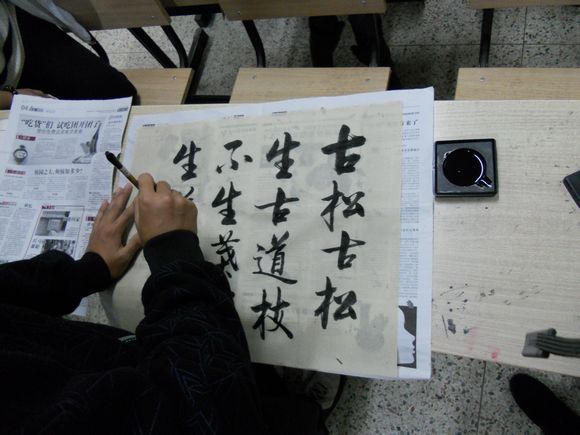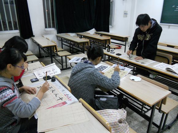 活动开始,大家先各自写了一幅字,由于大一的学生很久没有用过毛笔,都有些生疏,写得比较拘谨;接着邵泽雨同学对大家写的字一一点评,并且一对一进行指导。他说:“写字要干脆,不要怕写不好,一笔一笔下去,最后总能把字补圆”。同时也指出了一些同学在字的结构把握和笔画上的不足和改进意见。大家在邵泽雨同学的指导下,又开始了新一轮的练习。在此期间,邵泽雨也大方展示了自己的书法,大家都十分欣赏。两位党员同学全程参与,与同学们一起讨论书法、练习书法。最后,她们和大家交流了此次进社团的感想,并鼓励大家努力奋斗,积极入党。七点四十五分,社团活动在专业指导、融洽浓厚的学术氛围中圆满结束。