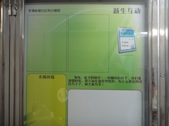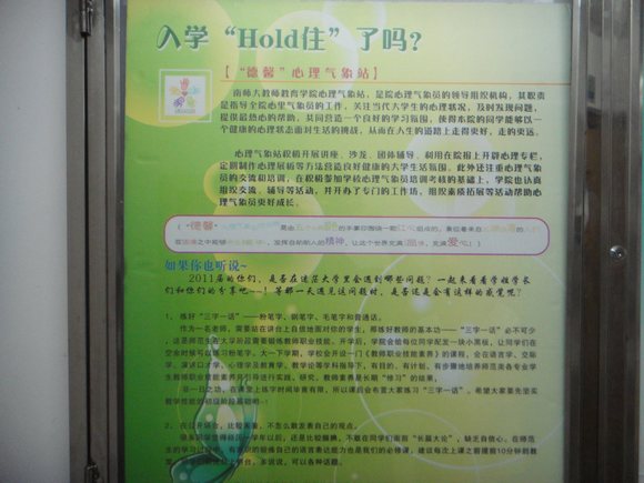 “德馨”心理气象站特地为新生们制作了时尚又实用的心理辅导橱窗展板——“入学‘hold’住了吗”。展板列举了新生尤其是师范生初入大学可能出现的心理不适,并从正确认识角色转变、有效进行自我评价、主动适应全新环境、培养生活自理能力等方面介绍了进行有效的心理调适的方法。此外,心理气象站还贴心地准备了新生互动版块,让11级师院学子们记录军训心情,吐露内心疑惑。小编们也会及时回复,为学弟学妹们排忧解难。此举有益于解决新生的各项心理问题,并为新生提供了一个与学院互动沟通的良好平台。