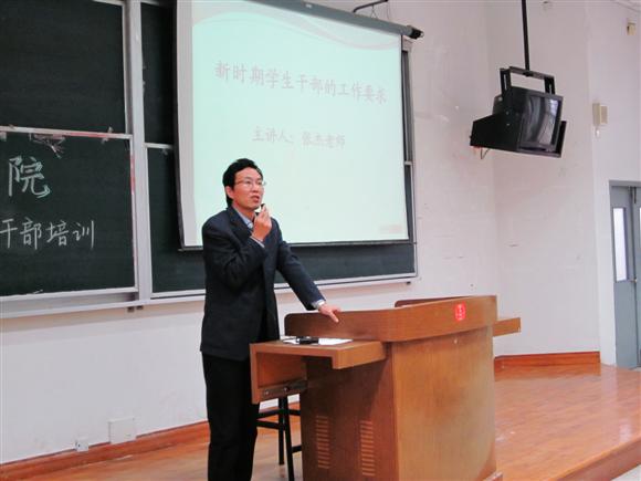 作为主讲人的张杰老师为大家带来培训班第一课——“新时期学生干部的工作要求”的讲话。从自己的大学生活讲起,与同学们分享了曾经担任学生干部的经历与心得,亲切平实的话语一下子拉近了与同学们的距离,风趣幽默的表达引起阵阵掌声。