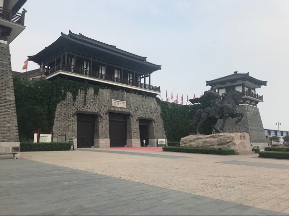 当天,团队成员们从项王故里正门进入,观摩了门前披坚执锐、雄迈威风的项王铜像,铜像之后就是项王故里的入口。正门是一座仿古的城门建筑,进门后,左右两侧顺石阶可登上古城楼,城楼室内是一些相关华夏历史与古楚文化的介绍。在城楼上可以鸟瞰整个景区,三进的楚风建筑尽收眼底。
