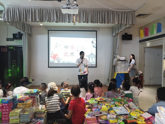 今天的活动主题是“中华武术”,这个主题并不贴近小朋友们的生活,也不是小朋友们熟悉的范畴,但今日主讲通过细致的备课和富有新意的授课形式,使得整个课堂妙趣横生,笑声不断。活动一开始,为了吸引小朋友前来听课,主讲播放了一段凄美婉转的《探清水河》,随着歌声的流转,不少小朋友和家长都被吸引了过来。待小朋友坐定后,主讲通过鼓励小朋友们上台进行自我介绍来促进课堂愉悦氛围的形成,在主讲的引导下,共有三位小朋友进行了展示。正式进入教学阶段后,主讲先给小朋友们解惑:“非物质文化”是什么,面对这样一个抽象的概念,主讲利用小朋友们手上的书本,生动形象地给小朋友们解释了“物质”与“非物质”的区别。接下来,主讲通过讲故事、举例子的方式介绍了以太极拳和五禽戏为代表的中华武术,包括它们的概念、起源、实践。为了让小朋友们更直观地感受中华武术的魅力,主讲播放了《少年张三丰》等视频,随着屏幕上“张三丰”武术的展示,小朋友们在台下的讨论也越来越热烈。不得不提的是,主讲精心准备的实践环节非常出彩,十分吸人眼球,主讲邀请了两位小朋友上台,与主讲一起做太极拳的前两节动作,一拳一脚,都给予小朋友们示范和纠正,而台下的小朋友们则看得津津有味。