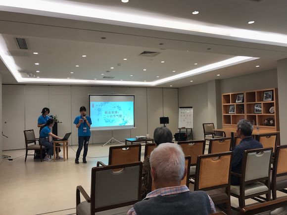 “锦绣夕阳行——大美中国之上善若水联欢会”正式开始,主持人方文文和曾洁茹对今日要讲解的主题——气象景观和水体景观作了具体介绍。方文文担任第一部分气象景观的主持人,华心怡为老人们演唱了歌曲《二十四节气歌》,引入第一个话题。接着张夏悦和王文玥为老人们朗诵《我的南方与北方》,两个人不同的音调和声线,搭配上歌曲配乐,让老人们从中体会到了南方与北方天气气象独特的魅力。第一部分结束,与第二部分衔接空闲时间,戈瑶和其他队员带领老人们做起了手指操,老人们积极地参与了进来。曾洁茹担任第二部分水体景观的主持人,她生动地向老人们介绍了水体景观凤凰古城沱江和云南泸沽湖,让老人们对这两个景观有了相当的了解,同时也激发起了老人们的兴趣。接着,小队成员分别表演了精心准备的歌曲串烧节目,演唱了著名民歌《浏阳河》、《月光下的凤尾竹》等,很多老人都随着音乐而轻轻哼唱起来。最后,小队所有成员为老人们演唱了歌曲《相亲相爱一家人》,我们今天的活动也在这首歌的优美旋律中结束。