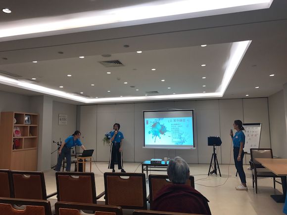 到达欧葆庭颐养中心,小队成员们便开始了今天的联欢会的准备,主持人曾洁茹和方文文开始了对设备等的检查,张佳乐和华心怡则去往老人的房间对我们今天将要进行的最后一次大型联欢会进行宣传,其他小队成员也在各自练习着今天要表演的节目,场面十分热烈。