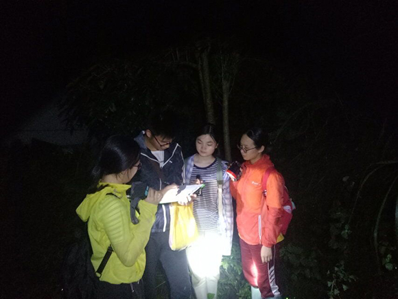 野外监测工作是辛苦的,尤其是对这些没有出过野外、走过夜路的学生来说,在野外监测的过程中,同学们常常会遇到一些困难,如天黑、道路湿滑、蚊虫骚扰、天气闷热等,但这些小麻烦丝毫没有打消成员们探究的热情。每遇见一只蛙都会激动不已,在辨认的同时,也拍下了许多记录照片。长肢林蛙、中华蟾蜍、泽陆蛙、黑斑侧褶蛙、武夷湍蛙、华南湍蛙、棘胸蛙、中国雨蛙、弹琴蛙、沼水蛙……,这些以前只在书籍、电视、网络上见过的动物如今活生生地出现在同学们的眼前。在深夜雨过天晴漫天的星辰下一边寻找,一边将它们的名字和特点深深印刻在脑海里。