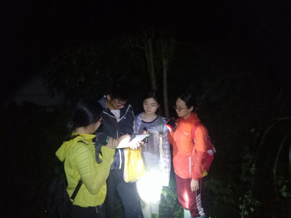 从8月2日野外检测工作开展以来,在戴老师的指导下,队员们又快又准地发现和收集监测目标样本,并进行进一步的仔细观察和辨认。每捕捉到一只具有代表性的类型的蛙,老师都会耐心地给队员指认讲解,包括其外部特征,生活习性,以及和相似蛙的辨别方法等。而对于一些难以发现的蛙类,如中国雨蛙以及声音很像中国雨蛙但声调略低的饰纹姬蛙,老师则教导队员通过其叫声来估计其数量。除了记录每条样线所监测到的蛙类种类和数量,监测过程中,记录员还会将山涧起终点将其水温,pH,空气温度和湿度等一一记录下来。