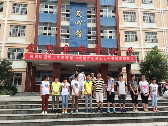 捐赠仪式伊始,金寨县希望小学校长率先发言,他首先历数金寨县希望小学发展的三个阶段,尤其强调周火生老人于1994年冬季第一次踏入金寨县后为金寨县希望小学和当地贫困学生的教育做出的不可磨灭的贡献,发言最后他向前来捐资助学的志愿者和大学生们表达了诚挚的谢意和把这项爱心事业发扬光大的希望。接着受资助学生代表发言表示,周火生老人对他长期的捐助使他在学生时代能心无旁骛地学习,现毕业四年多仍不能忘记这一份沉甸甸的关怀,并称周火生老人为“希望的使者”。最后周火生老人代表现场75位志愿者发言,他回忆第一次来到南溪镇捐资助学的往事,表达了对受资助学生成为栋梁之才的欣慰喜悦之情,并满怀激情地希望他的爱心事业能星火相传,这也更让我们实践团队的队员们深感责任重大。