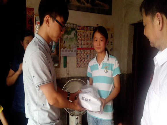 由于时间限制,只回访了两位受资助学生。第一位受资助学生张昕和她的母亲、两个弟弟本来是农村户口,因父亲外出打工,为了上学便利一家四口在金寨县南溪镇租了一套简陋破旧的小平房,当我们把爱心人士张奶奶资助的被单文具等物资送到她手中,懂得感恩的她立即给张奶奶致电表示谢意。实践小队队员与张昕同学和她的家人亲切交谈,初步了解了张昕同学的学习和生活现状,在表达了对她学习进步的诚挚祝愿后,我们来到下一个受资助学生晏洋家中。晏洋生活在一个单亲家庭,由母亲和姥姥姥爷照顾抚养,当天晏洋和他的母亲都不在家,我们把物资交给他的姥姥姥爷,姥姥告诉我们:晏洋由于成绩优异被列入当地的春蕾资助计划,得知这个消息,实践小队队员都由衷地为晏洋高兴。