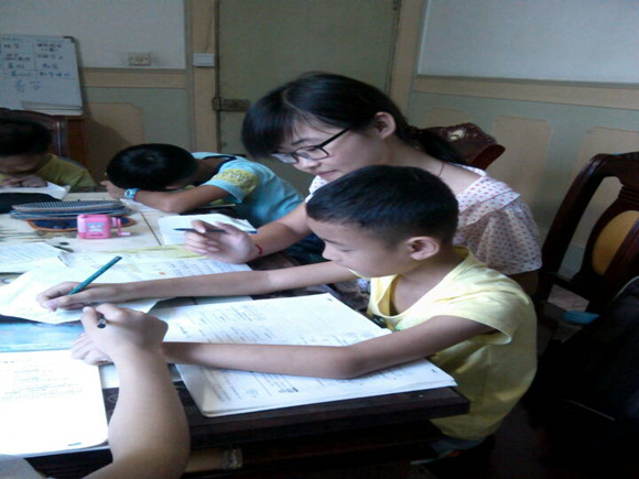 7月3日上午,经过一个小时的颠簸,我们的“小老师”两人一组到达社区活动室。其中有一组分配到去教授一个初一升初二学生,碰巧那天这位学生的大一岁的表哥来拜访,于是,我们的队员们义不容辞地同时辅导两人。青春期的孩子不免争强好胜,刚开始这位学生有点自由散漫,并不把“小老师”说的话放在心上,但是自从他的表哥来了后,学习态度180°大转变,追着“小老师”问各种问题,气势上完全不输他的哥哥,而我们的“小老师”不厌其烦地解答他的问题,形成了好问多思的良好学习氛围。他的哥哥基础很好,相比较而言,学习轻松,为了提升自我,在一旁苦苦思索一些竞赛题目。