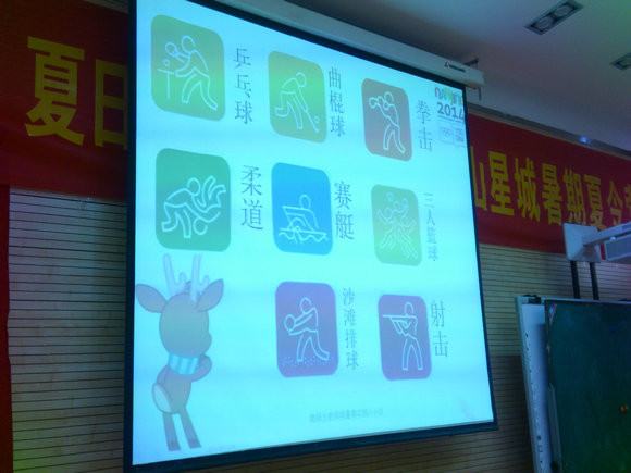 经过前三天的熟悉磨合,前来参加活动的小朋友们已经和志愿者们相处得十分融洽。今天的课题是“普及青奥知识”。首先讲解员张晓文介绍了青奥会的由来,并着重讲解了2014南京青奥会的会徽和吉祥物。随后请小朋友们看图猜出比赛项目,课堂气氛十分活跃。之后又介绍了青奥会的口号与服装,并组织观看了青奥会宣传片和青奥加油视频。辨认国旗环节后,“你问我答”环节再一次点燃了课堂的热烈氛围。一道道有趣的知识问答,巩固了今天课上讲解的知识,加深了小朋友的记忆。最后是“青奥,我想对你说”环节。志愿者与小朋友们一起画出自己喜欢的比赛项目,彼此分享交流。还有小朋友举起自己的画大声说出对青奥会的期盼,由志愿者拍摄视频留念。