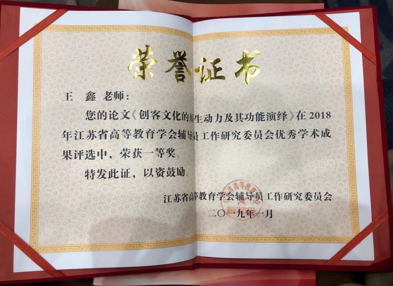 研究生辅导员王鑫老师荣获高校辅导员工作优秀学术成果一等奖的好成绩。