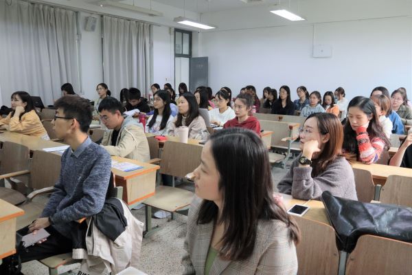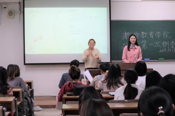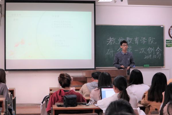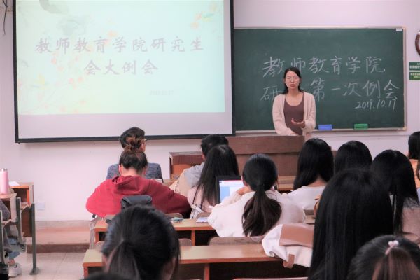 “我们首先要踏踏实实把研会工作做好、做完善,把学生工作和学业结合起来。”王老师着重介绍了研究生会的机构设置、管理体制以及主席团、各部门成员,强调了研会需要承担的职责和义务。其中,研会常规活动包括值班、例会、文体活动;特色活动主要是开展以教育硕士为主体,以提高专业基础、教学能力和学术素养为目的的学术沙龙、教师发展论坛等。王老师希望所有研会成员都能具备有学生干部的意识,按时完成研会日常工作,尊重学生隐私信息,遵守校纪校规,不做违法之事。在活动中,研会成员既要扮演好活动组织者的角色,也要积极参与相关活动如暑期社会实践、科研创新项目、教师技能大赛、迎新晚会等,不断提高自身组织策划能力和科研实践能力。