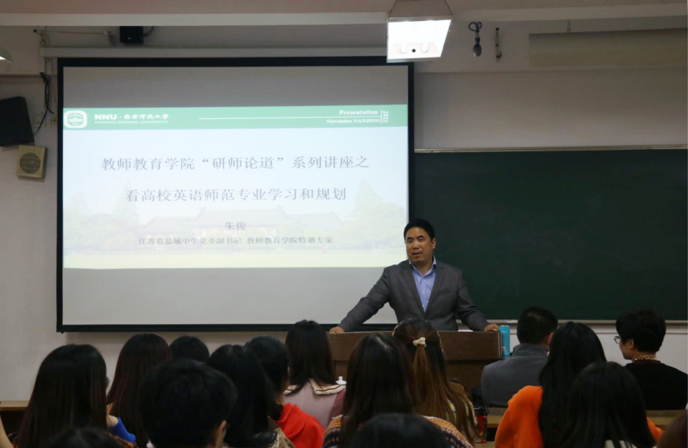 “从高考改革看高校英语师范专业学习与规划”讲座于仙林校区学明楼104教室开展,江苏省盐城中学朱俊校长应邀主讲,讲座由刘建院长主持,许立新老师和博彩网址大全