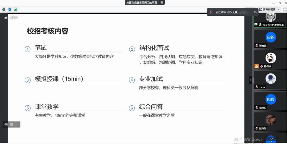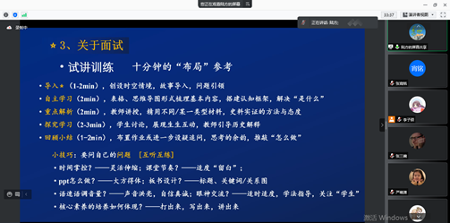 历史专场中,学科教学(历史)专业的陆方学姐介绍了有关校招和考编的相关信息,重点介绍了自己的面试经历和面试技巧。她建议学弟学妹们提前了解心仪学校的校史、杰出校友、校风校训、学科特色课程等。重视试讲训练,形成“十分钟”授课“布局”,包括导入、自主学习、重点解析、探究学习以及回顾小结。建议大家磨炼教师基本功,自信大方站稳讲台。