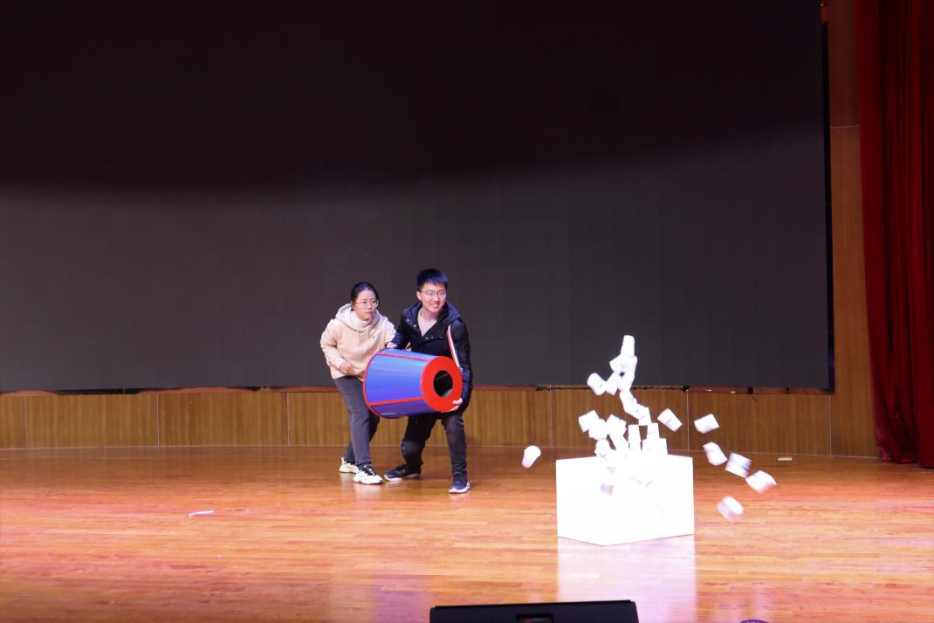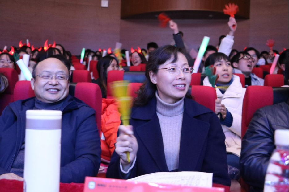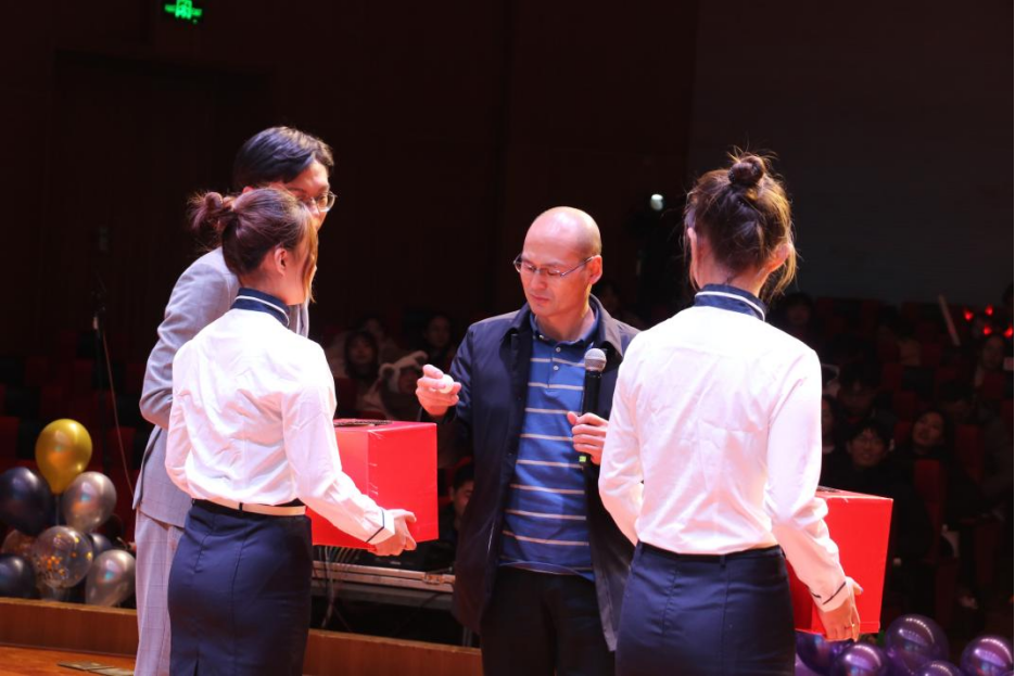 接着进行中场第二次游戏抽奖环节,刘更生、庞明勇两位老师上台抽取二等奖并为中奖同学颁奖。在短暂的“筷子夹取乒乓球”小游戏结束后,黄菊香老师上台抽取一等奖并致辞,她祝愿大家在新的一年虎虎生威、如虎添翼,继续书写师院的崭新篇章,再一次点燃了全场气氛。