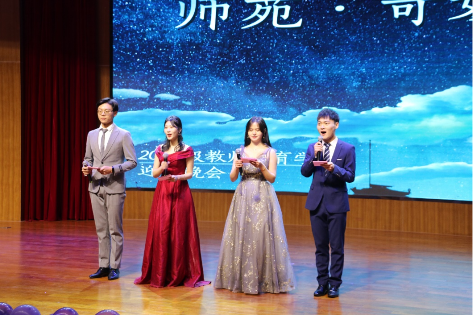 在热烈的掌声中,杨新、李思妍、方舟、王顺航四位主持人缓步登台,宣布晚会正式开始。