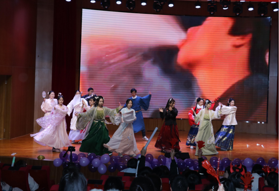 抽奖结束,节目精彩继续。学科历史的同学们带来汉服走秀《九州华裳秀》,配合简明的服装讲解,流光溢彩,令人目不暇接。马俊伊、齐绍敏、杜云峰三位同学的歌曲串烧《这个冬天有点甜》,歌声宛转悠扬、娓娓动听。黄馨仪同学的街舞串烧《一波王炸BOOM》炸裂全场、引起场下阵阵欢呼。张宝同学的《孤勇者》聚焦小人物,为梦想不断拼搏奋斗。