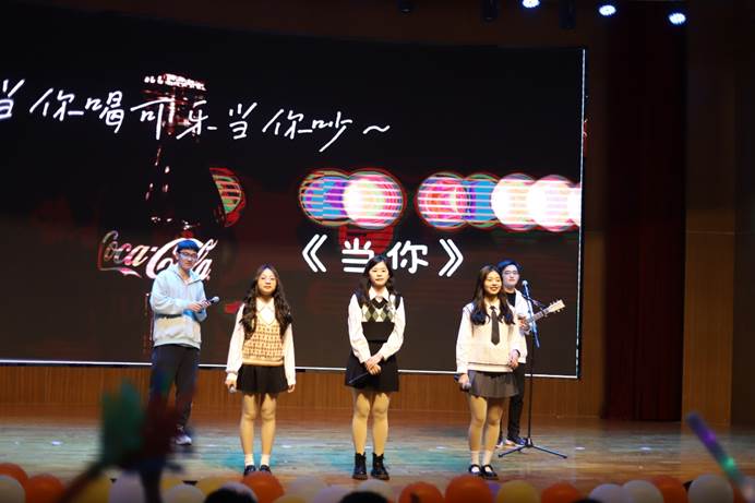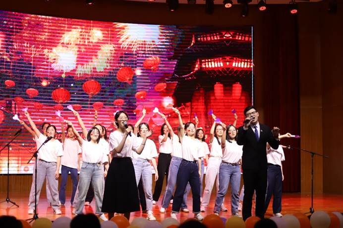 精彩不停,学科数学班的同学带来歌曲串烧,美妙的歌声引人入胜,全场观众仿佛一同在《稻香》的虫鸣中寻找幼时的美好,在《当你》的旋律中体会年少的懵懂,在new boy 的节拍中拥抱热烈的青春。学科地理班的同学带来舞蹈串烧《奔赴下一场排队》,跳跃的音符演奏青春的活力,动感的舞姿展示青春的魅力。最后,晚会在学科化学班同学的合唱《相亲相爱》中缓缓落下帷幕。