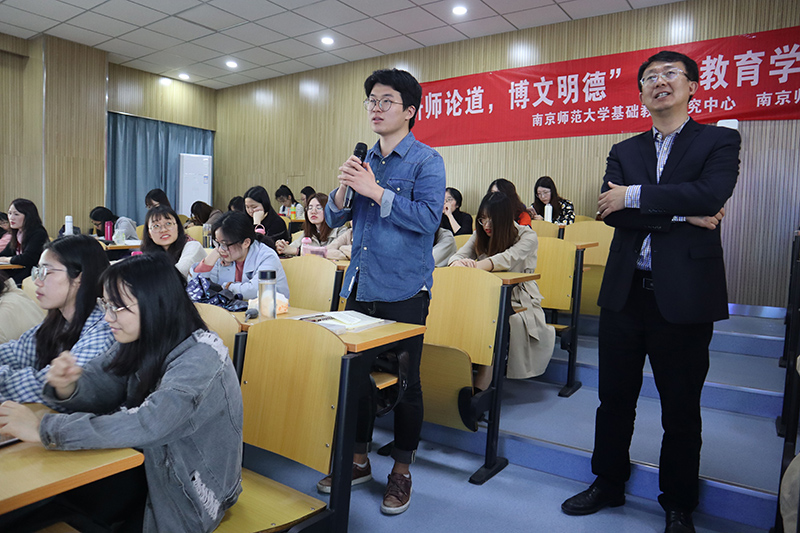 闫勤老师将报告会分为了报告讲解与互动环节两部分。在讲解过程里,她讲述了自己创建南京玄武外国语学校并担任校长的经历,并结合自身的教学、管理经验,从“教育之道”和“为师之道”两个大方面进行阐述。教育之道包括“穿鞋之道、围墙之道、动车之道以及皮筋之道”四个角度,“穿鞋之道”提醒大家要为自己和学生寻找合脚的“鞋”,时时刻刻注意把生活中的教育经验转化为教育行为;“围墙之道”比较中外高等学府围墙的有无,引发了同学们“没有围墙的教育会不会更有启发?”的思考;“动车之道”则蕴含着让学生有自我发展的诉求、给学生自我发展的空间的道理;最后的“皮筋之道”,让大家明白,作为研究生和未来的老师,要给自己、给学生合适的张力,设定合理的目标。闫老师的讲解深入浅出,例证充实,点燃了在场听众思维的火花。