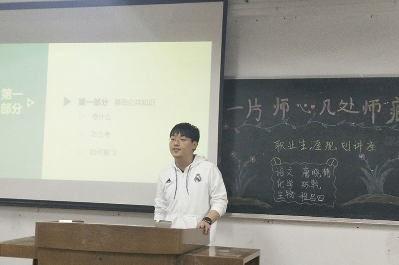 第二位陈乾学长主要分享了南京考编的经验,并对校招面试也给出了一些建议。关于考编,学长从笔试内容、面试准备两个方面进行讲述。笔试分为基础公共知识和学科专业知识两大块,学长分别从考什么、怎么考以及如何复习三个方面切入对这两部分的内容都作出了非常详细的介绍。同时,还列举了许多考试真题,分析题目类型和特点,并提供了解答各类题目时所需的方法和技巧。关于面试,学长以南师附中树人学校为例向大家讲述自己的经历,并提供了一些常见的主题。最后学长借以江敏老师的话对此次分享做了总结,在教学方面给大家提出十分中肯的建议。