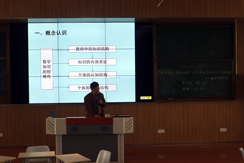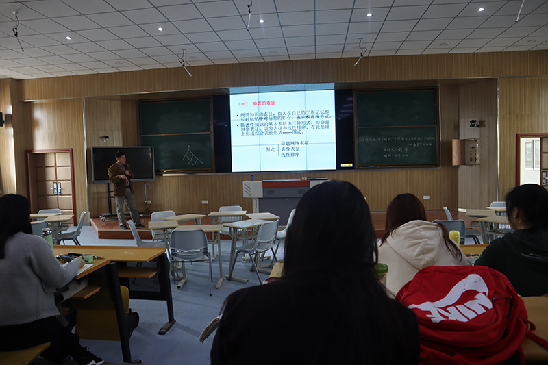 讲座伊始,喻平老师和同学们讨论了教学与知识之间的关系,他认为知识的类型不一样,教学的方法也会不一样,那么不同的知识在我们头脑中是怎么样储存下来的呢?针对这一问题,喻平老师向同学们系统地介绍了知识的表征和认知结构,使得大家进一步加深了对于知识和教学之间的理解。