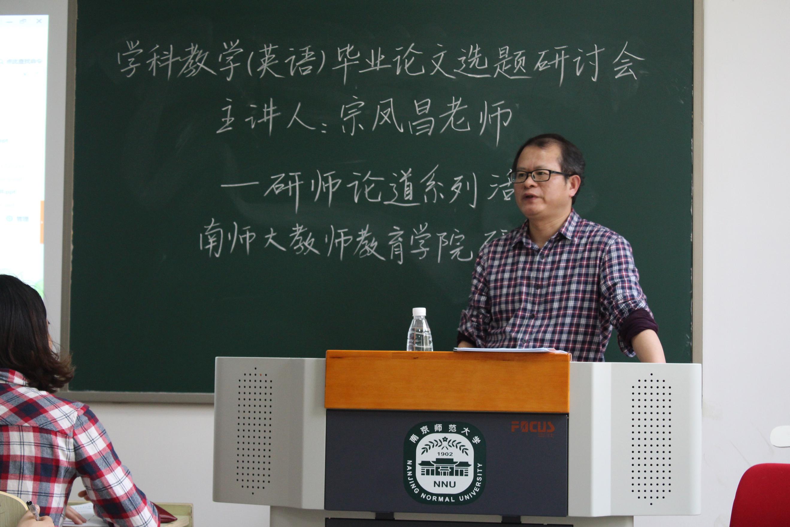 “善学求知,研师论道”系列活动之子活动学科教学(英语)毕业论文选题研讨会在随园校区北大楼208成功举办。本次学术活动邀请到南京市第一中学特级教师宗凤昌老师,研讨主题是学科教学(英语)毕业论文选题的相关研究。本次活动由孙玲老师主持,活动形式以讲座形式为主,学科教学(英语)专业的全体同学均到场参加。