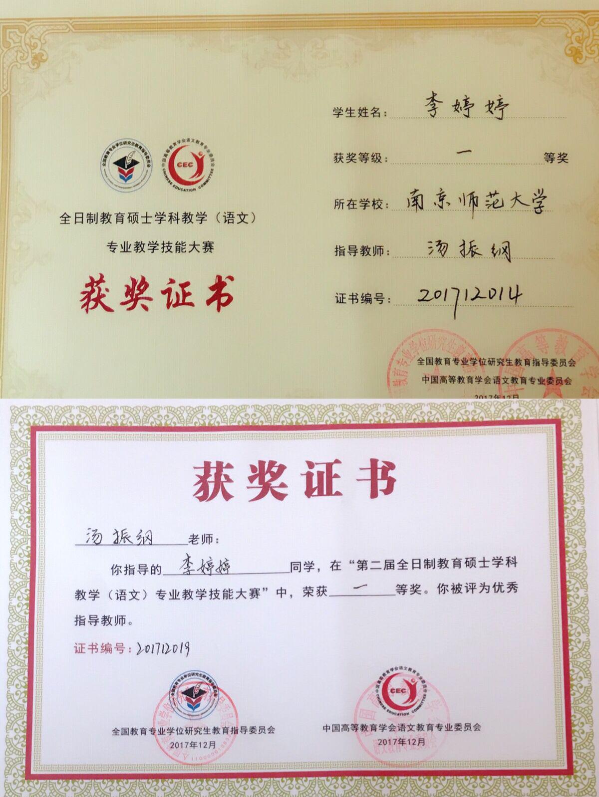 最终,李婷婷同学没有辜负学校和老师的期望,获得了本届全日制教育硕士学科教学(语文)专业教学技能大赛的一等奖!汤振纲老师也被评为优秀指导老师!博彩网址大全