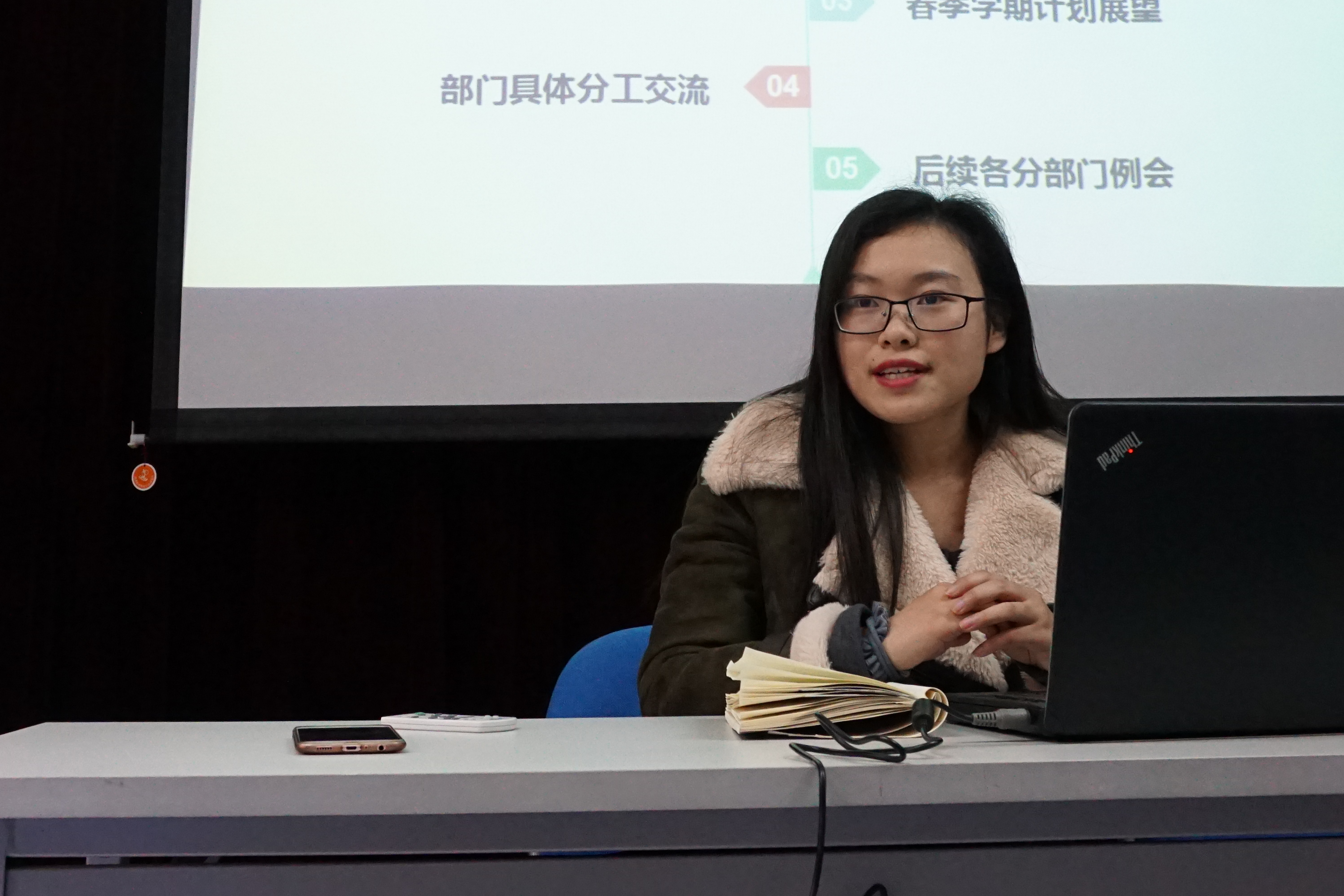 接下来,主席团其余成员以及各部门部长根据上学期的收获与经验分别述职,反思工作中出现的不足,依据本学期的相关工作计划对自己与部门成员提出了更高的要求。