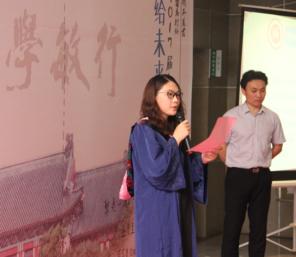 接着,全日制研究生代表学科教学(物理)的陈怡同学发言,她深情地回顾了在随园求学的点点滴滴,表达了对于母校的眷恋不舍,对于学科导师、实践导师和辅导员等各位老师的深深感恩,对于同学们的无限祝福,一番话语质朴而情深,道出了毕业生们的心声。随后,各学科的导师代表纷纷在留言板上留下对于毕业生们的寄语,无论是满怀期盼的希望,还是饱含深情的祝福,语重心长的勉励,都给学子们留下了深刻的印象。优秀毕业生代表向恩师献上纪念品,表达了对恩师的感恩与祝福。