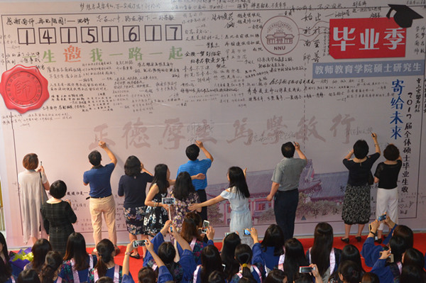在歌声回荡的大厅中,喷绘上写满了师生的寄语,满满的都是憧憬和未来。毕业生们还沉浸在毕业的幸福和伤感中,欢笑着、雀跃着和敬爱的老师合影留念。一入南师门,一生南师情。我们有理由相信,他们必将秉承着“正德厚生,笃学敏行”的校训,胸怀着“德高为师,身正为范”的师训,在自己的岗位上砥砺自我,拼搏前行,为成为未来教育家而努力奋斗。(文/苏从余 图/傅莹)