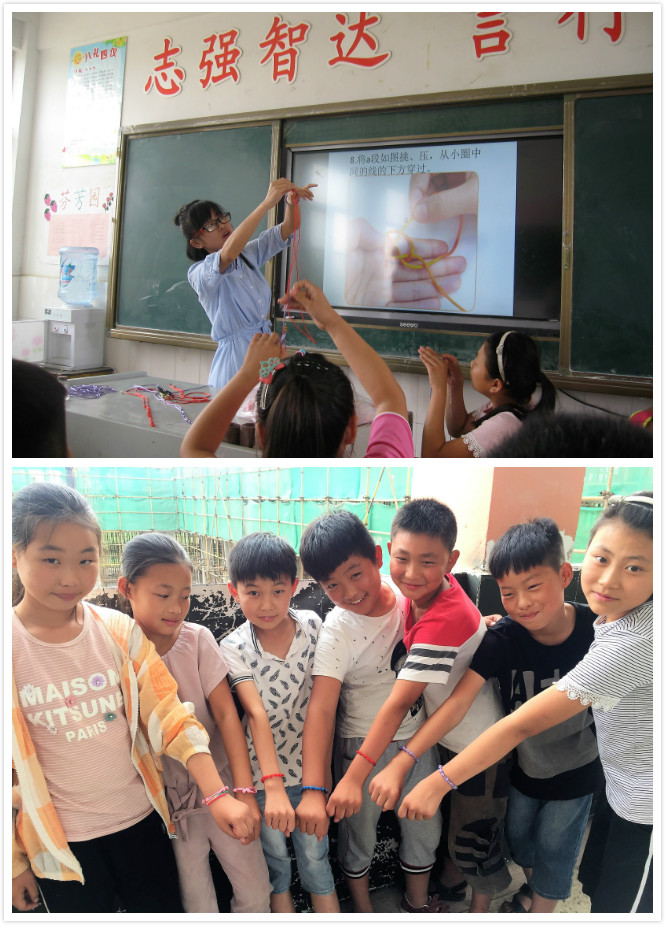 在支教团老师的耐心教学下,孩子们一个接一个地学会了纽扣结的编法,并在此基础上自己制作了纽扣结手链戴在手上,第四天的支教活动在师生共同的动手实践中圆满结束了。