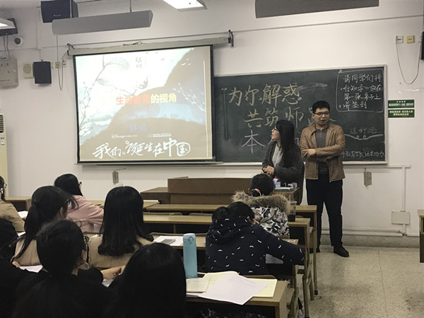 理科交流会在210教室同时进行,思政方向的江舟从《朗读者》导入,从生命教育视角来解读《我们诞生在中国》这部电影。解读从三个方面展开:一是生命教育的诠释。江舟注意到南师大校训中的“厚生”两个字,解读教育中的“厚生”,指出生命教育应成为指向人的终极关怀。二是影片解读。江舟简介了《我们诞生在中国》这部电影的创作背景,放映电影片段并配以及时的解说,将猴子、雪豹等动物与当下青少年的成长处境相联系。江舟细致地从以下三个视角解读:欣赏多彩生命,培育家园情怀;体会生命历程,增强精神力量;参悟生死规律,扬帆人生旅程。三是思考与展望。江舟希望通过这次的解读启发同学们:坚定信念,做有情怀的教师;启智育德,做有智慧的教师。