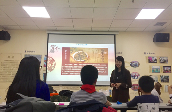 在介绍过端午节的起源、传统民俗后,到了最激动人心的知识抢答环节。主持人用ppt展示题目,学生们各个积极踊跃,参加知识抢答,现场气氛十分活跃。在轻松愉快的氛围中,学生们加深了对端午节知识的了解与认识。