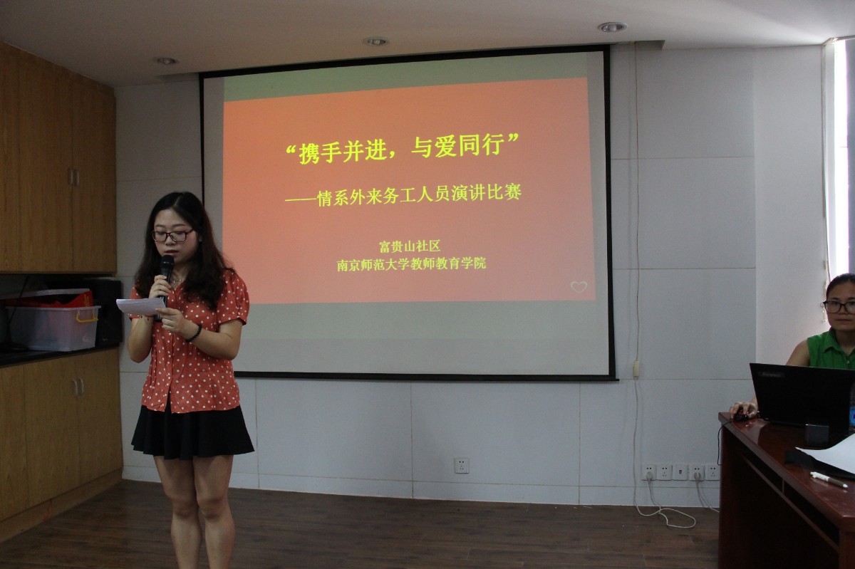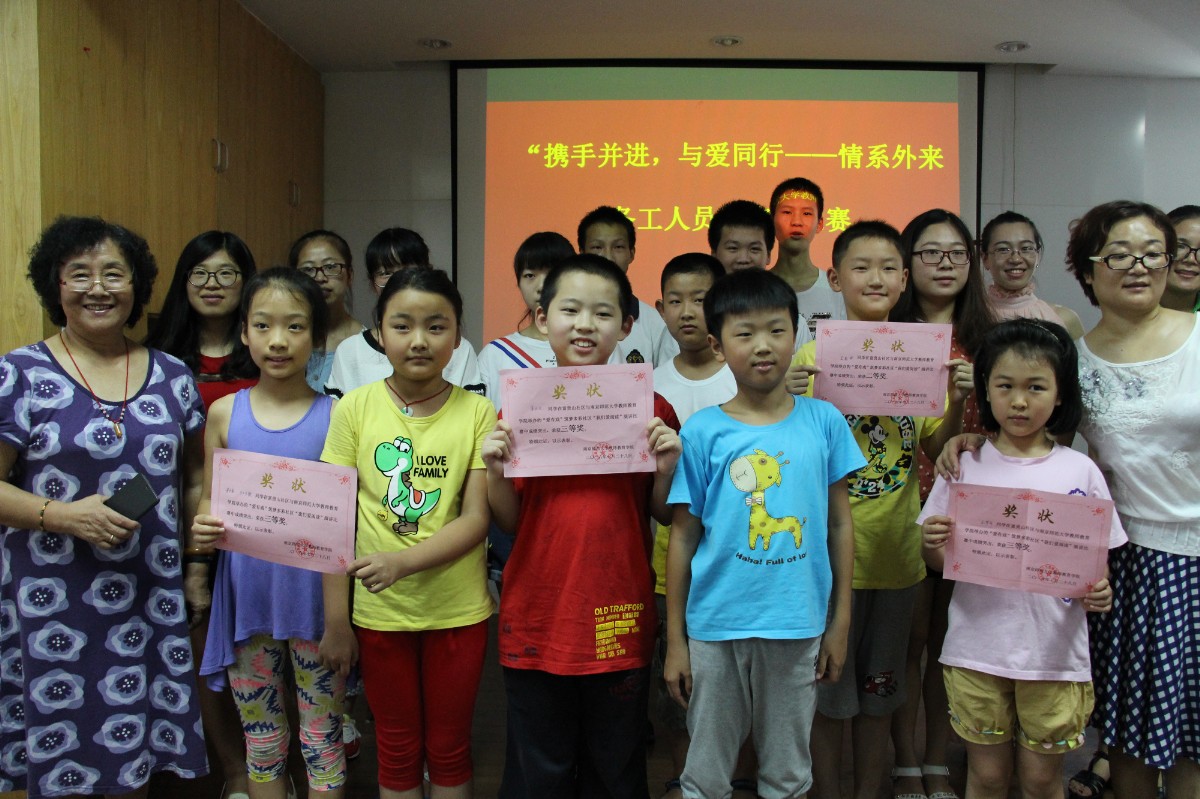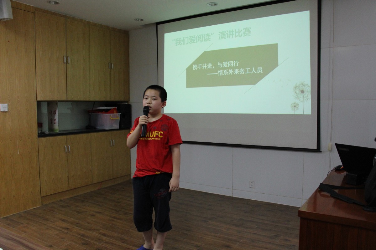 为了让年轻的一代关注这一群体,学会尊重这些努力工作的人们,学会感恩他们给我们的城市建设带来的贡献,也学会珍惜当下幸福的生活,今天,我们在此开展以“携手并进,与爱同行——情系外来务工人员”为主题的演讲比赛。5名参赛选手的演讲都很精彩,就关于外来务工人员发表了他们自己的想法,其中2号选手联系了自己的生活经历,发出了作为外来务工人员子弟的心声,非常感人。4号选手也表示了对外来务工人员的尊重与认同,感谢外来务工人员为我们的城市最初了贡献。郑梦肖同学作为评委,向参加比赛的选手提出了几点建议,鼓励他们演讲时要自信,眼睛要对着观众,大声的说出演讲题目。最后社区胡书记向获奖选手颁发奖状。